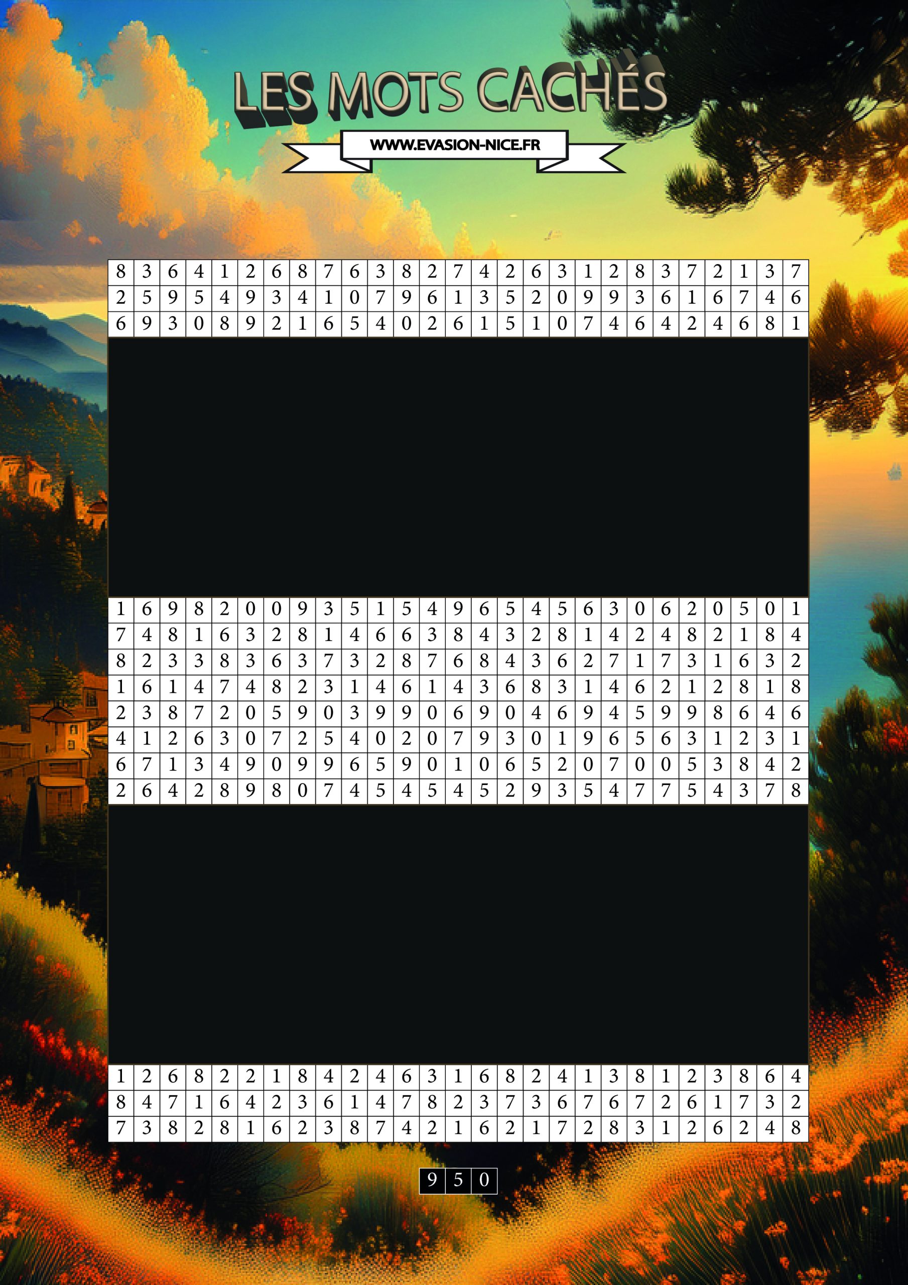 But : Colorer les 9, les 5 et les 0 dans la grille afin de faire apparaître des mots qui y sont cachés